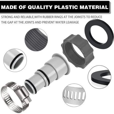 【Nombreuses possibilités d’utilisation pour adaptateur de piscine】 L’adaptateur de tuyau de pompe est adapté pour les tuyaux des systèmes de filtration, des pompes submersibles, des pompes de piscine, des pompes de filtration, des filtres à sable ou des vannes d’arrêt. Nous vous recommandons d’éviter d’utiliser des colliers de serrage dans la zone où la conduite d’eau se trouve à la sortie d’eau.