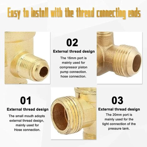 - 【Conception haute performance】 Notre soupape de pression a une conception de filetage externe à trois voies, a une résistance à la pression, une résistance à la corrosion, des performances élevées et une grande fiabilité, une étanchéité solide et peut remplacer la soupape dispositif de retenue du compresseur d’air usé ou endommagé. C’est un excellent choix pour les accessoires de compresseur d’air.