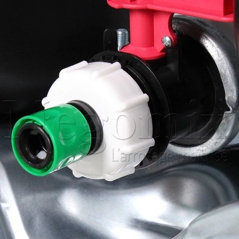 Cet ensemble est composé du bouchon adaptateur et de l’embout type arrosage femelle pour connecter directement votre tuyau d’arrosage à votre cuve de récupération d’eau.