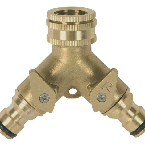 Nez de robinet laiton 2 circuits, sorties raccords rapidesNez sélecteur 2 circuits avec vanne d’arrêt. 20 x 27 – 15 x 21 (3/4” – 1/2”).