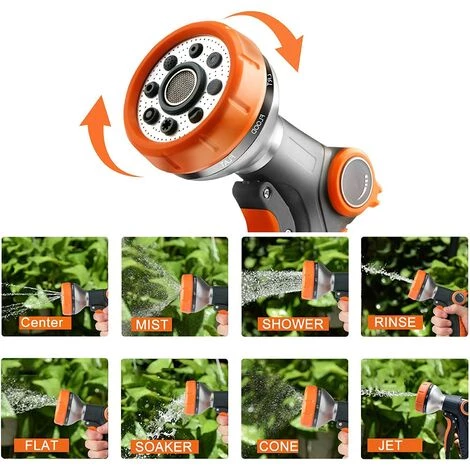 8 modes d’arrosage différents : le pistolet d’arrosage dispose de 8 types de réglages d’arrosage (brume, cône, douche, centre, inondation, plein, jet, plat) qui peuvent être facilement ajustés par le sélecteur de pulvérisation Spin-Click. De la haute pression au niveau doux, ce qui est idéal pour l’arrosage des plantes, la douche des animaux de compagnie, le nettoyage des fenêtres et d’autres nettoyages en plein air.